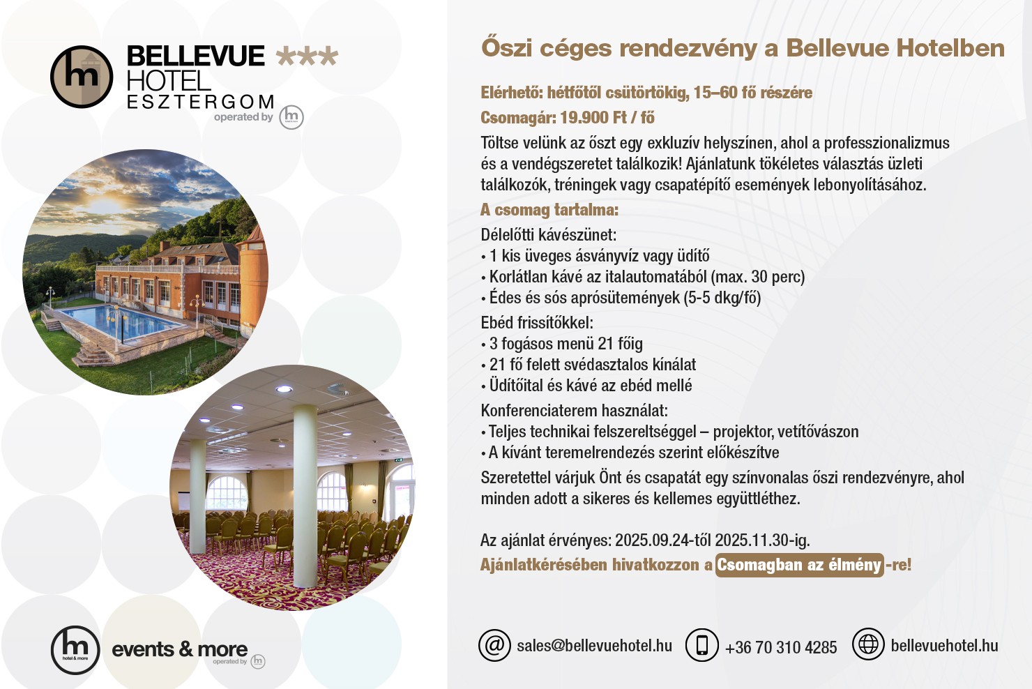 A parkolásra terhét is levesszük a vállairól, a rendezvényekre érkező vendégek számára több mint 60 autó parkolására van lehetőség a szálloda szabadtéri parkolójában. A Dunakanyar és Esztergom nevezetességei és programjai remek kiegészítést kínálhatnak rendezvényéhez.